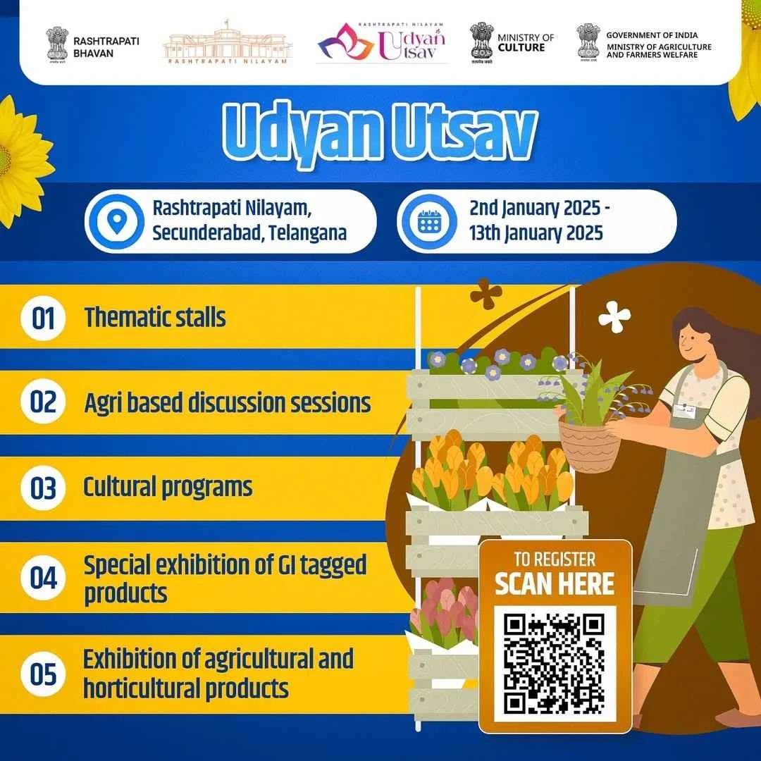 The exciting Udyan Utsav 2025 is finally here! Held at the beautiful Rashtrapati Nilayam in Secunderabad, this lively garden festival is a perfect mix of nature, culture, and eco-friendly living. Happening from January 2 to January 13, 2025, the event is packed with stunning flowers, local plants, sustainable products, and so much more. Whether you're into gardening, love food, or just looking for a fun family day out, Udyan Utsav has something for everyone!